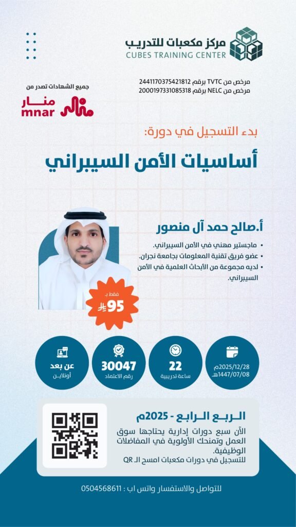 تهدف هذه الدورة إلى تزويد المشاركين بالمعرفة والمهارات الأساسية لحماية الأنظمة والمعلومات من الهجمات والاختراقات الإلكترونية، وفهم المخاطر السيبرانية التي تواجه الأفراد والمؤسسات في العصر الرقمي.