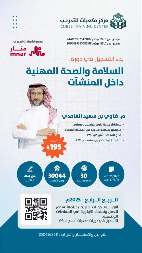تهدف هذه الدورة إلى تزويد المشاركين بالمعارف والمهارات اللازمة لتطبيق إجراءات الصحة والسلامة المهنية في بيئة العمل، بما يضمن حماية العاملين والممتلكات وتقليل الحوادث والمخاطر.