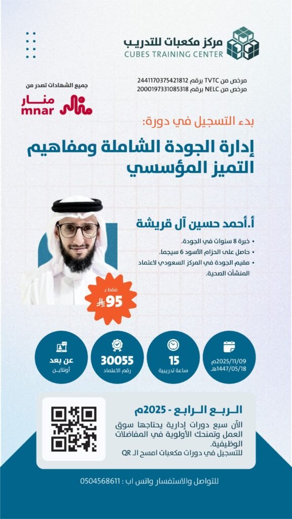 تركز الدورة على بناء ثقافة الجودة المستدامة، وتحسين العمليات، ورفع كفاءة الأداء لتحقيق رضا العملاء وتعزيز التنافسية المؤسسية وفق أفضل الممارسات العالمية ومعايير التميز.